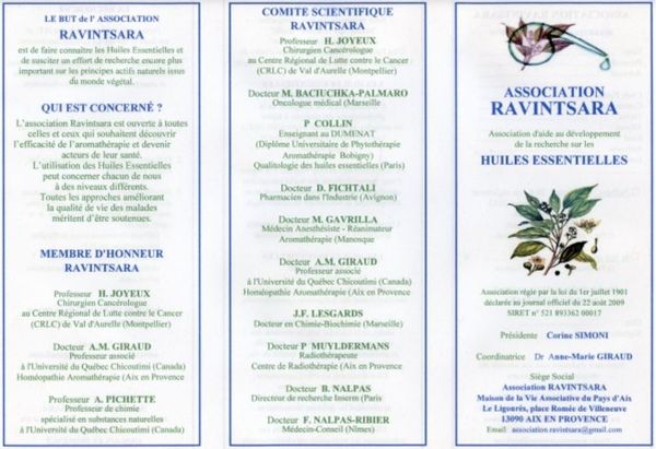 Par rapport aux personnes figurant parmi les membres d'honneur et membres du conseil scientifique de l'ADRHE, on trouve en plus pour l'association Ravintsara le membre d'honneur le Professeur A. Pichette (Canada), et comme membres du conseil scientifique le Docteur M. Baciuchka-Palmaro Oncologue médical (Marseille) et J.F. Lescards docteur en chimie-biochimie à Marseille.