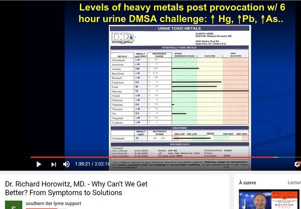Le congrès, intitulé "Les nouveaux traitements naturels de pointe", était organisé par l'IPSN en partenariat avec Santé Nature Innovation[25], deux organismes ayant des pratiques douteuses [26][27][28]. Sujet de l'intervention du Dr Horowitz: "Quelle stratégie adopter contre la maladie de Lyme, transmise par les tiques ?". L'écoute de la vidéo de son intervention[1] est instructive, outre que selon lui, la maladie de Lyme ou borréliose peut induire une série de pathologies impressionnante dont l'autisme, on y apprend qu'il faut pratiquer des chélations.
