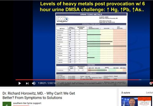 On peut constater dans ce document, diapositive page 36 (illustration ci-contre) que Richard Horowitz fait effectuer des tests de métaux lourds dans les urines après provocation (en français on utilise aussi le terme de mobilisation) par le laboratoire d'analyses Doctor's Data, un laboratoire douteux utilisé par les praticiens proposant des thérapies par chélation,[22][23] [24]